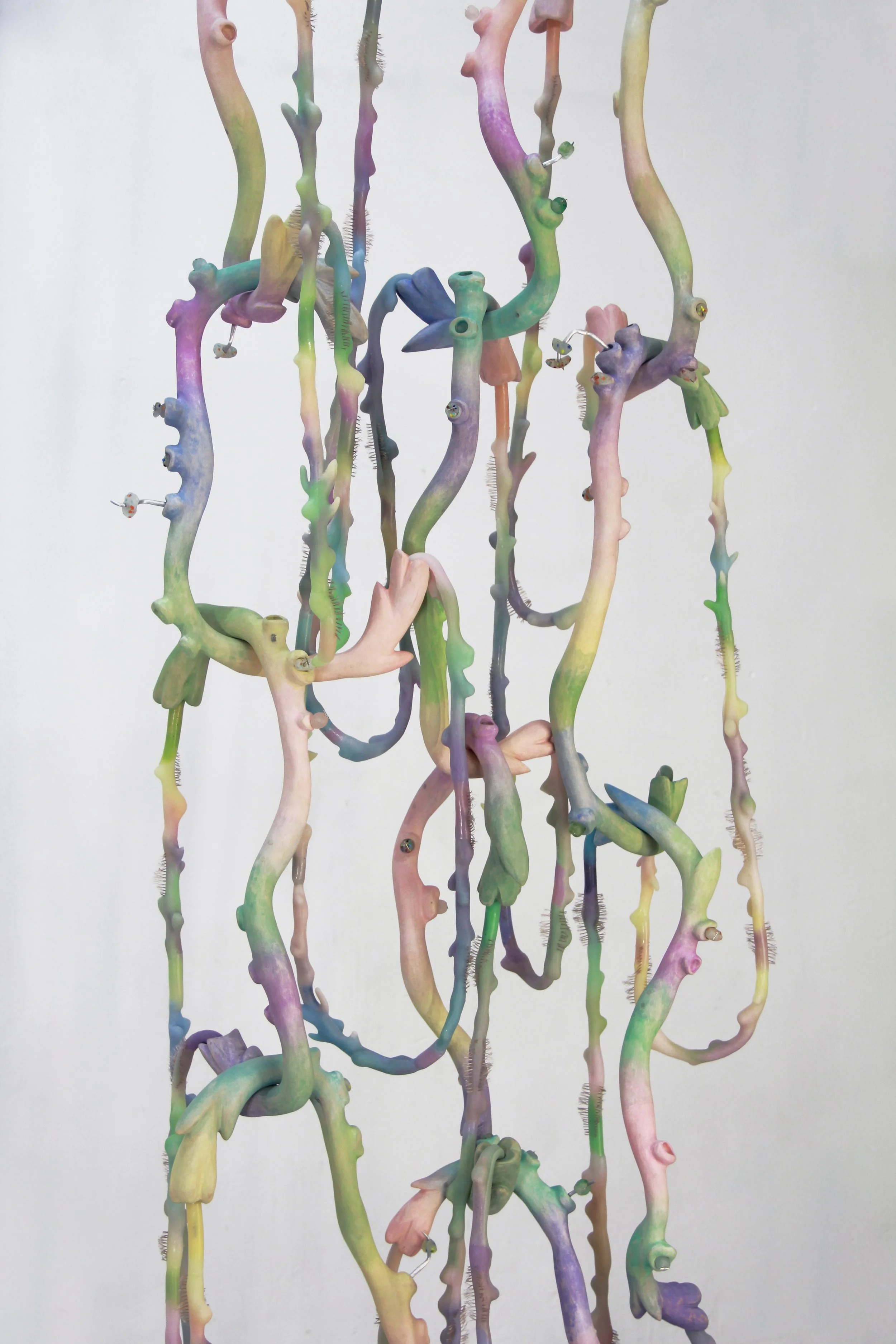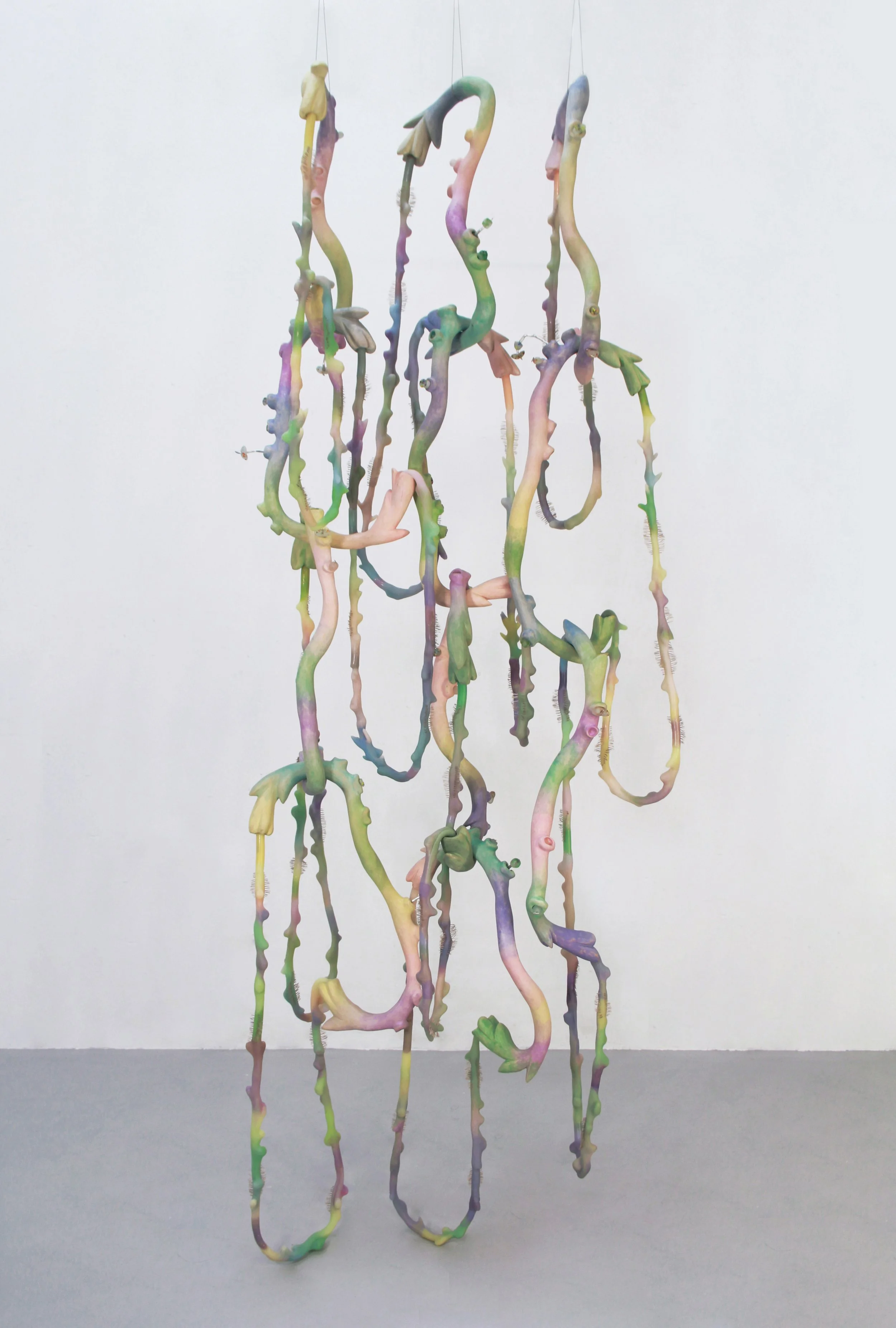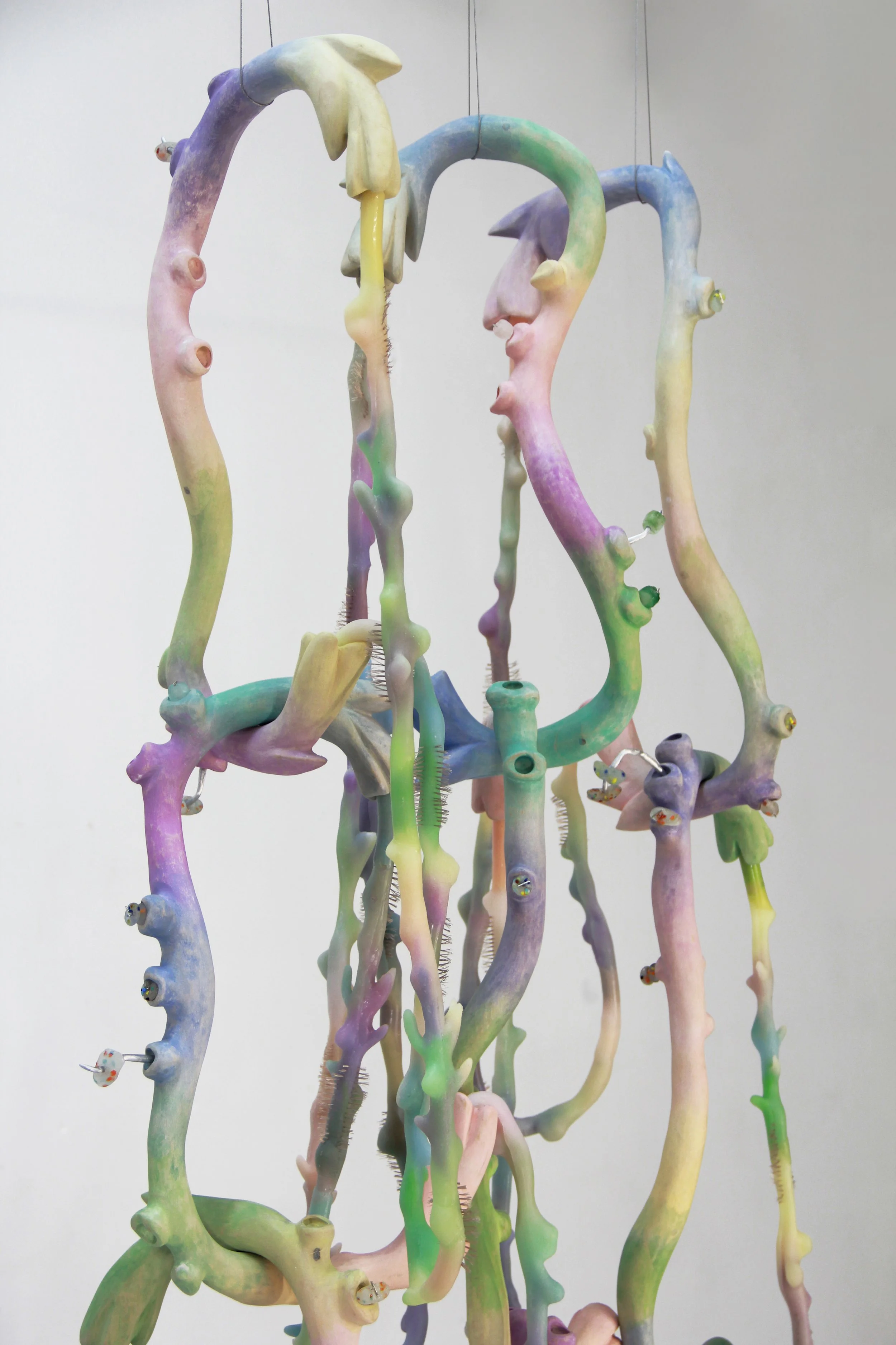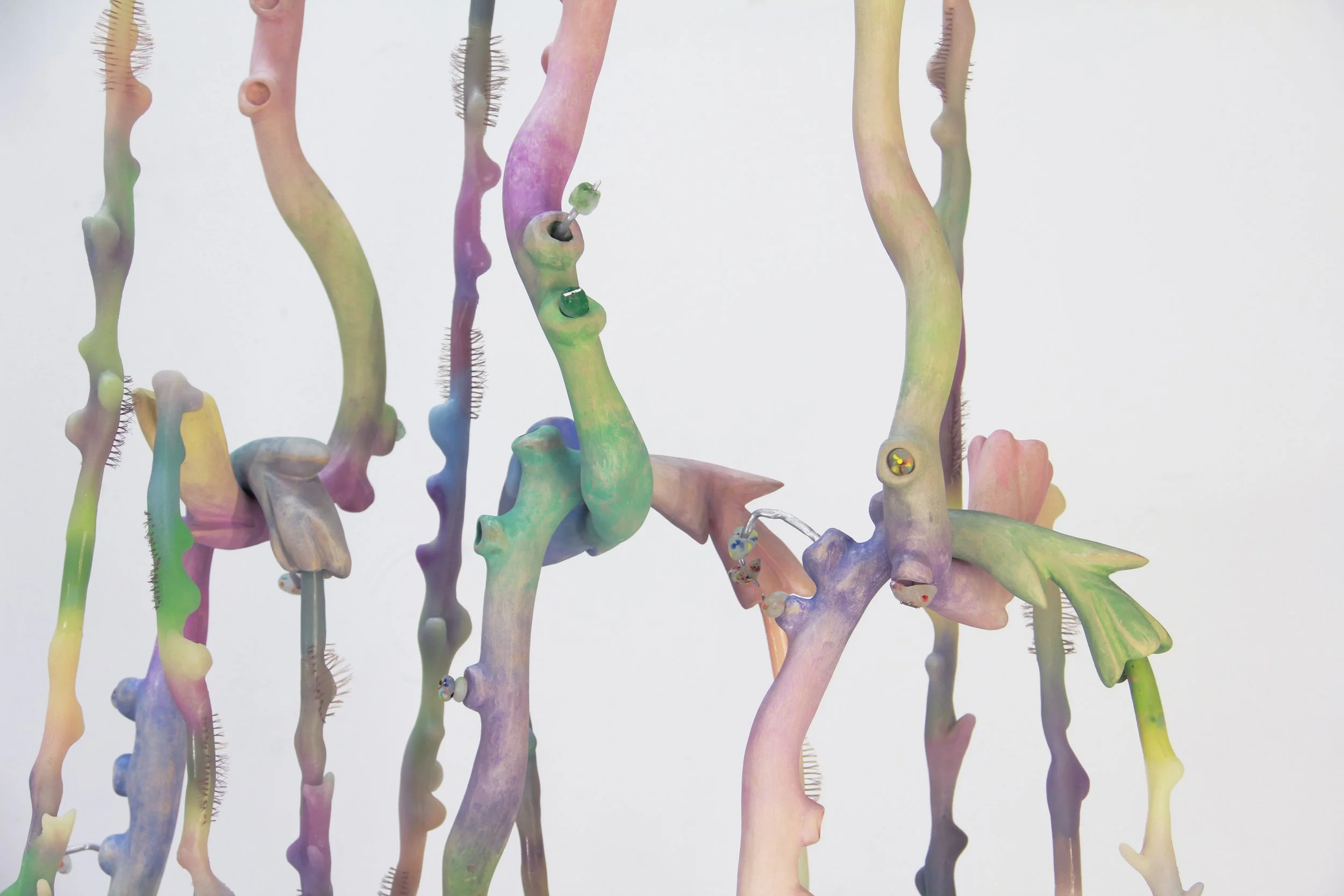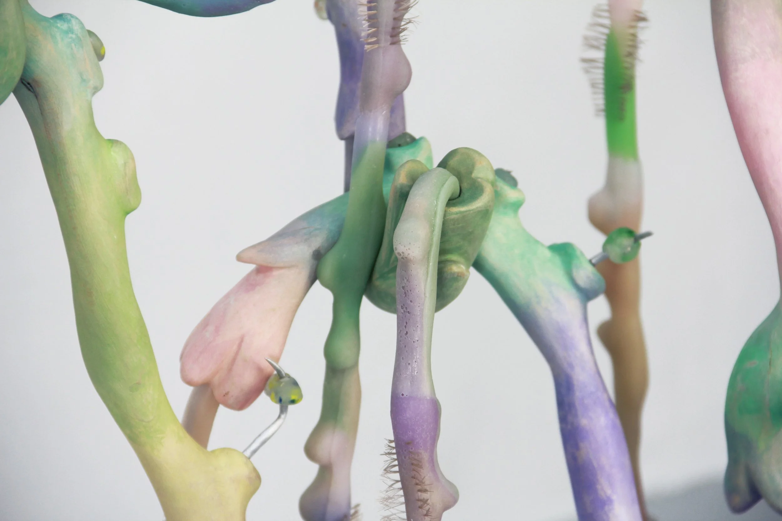 The forms of the works derive from organs and their appendages—such as haustoria, pistil, epidermis, skin, and secretions—which serve functions like contact with the external world, multiplication, information exchange, or nutrient absorption. Through details in form and material, each piece intertwines with the others like vines, weaving together and forming a symbiotic landscape.