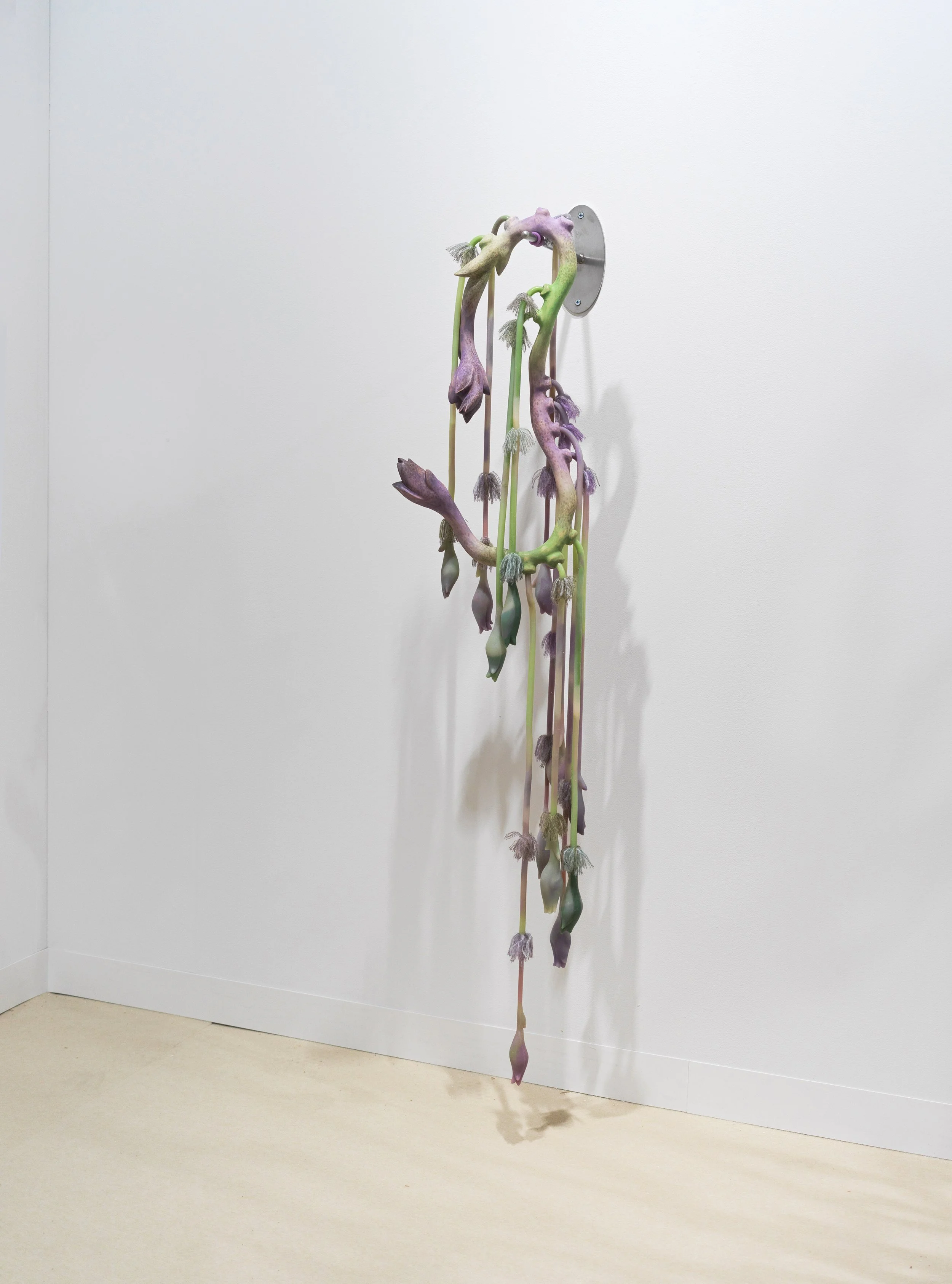 Haustorium: Feeding , 2025, Dyed basswood, silicone, watercolor, acrylic, mohair, silk, stainless steel, 160(h) x 35(w) x 30(d) cm