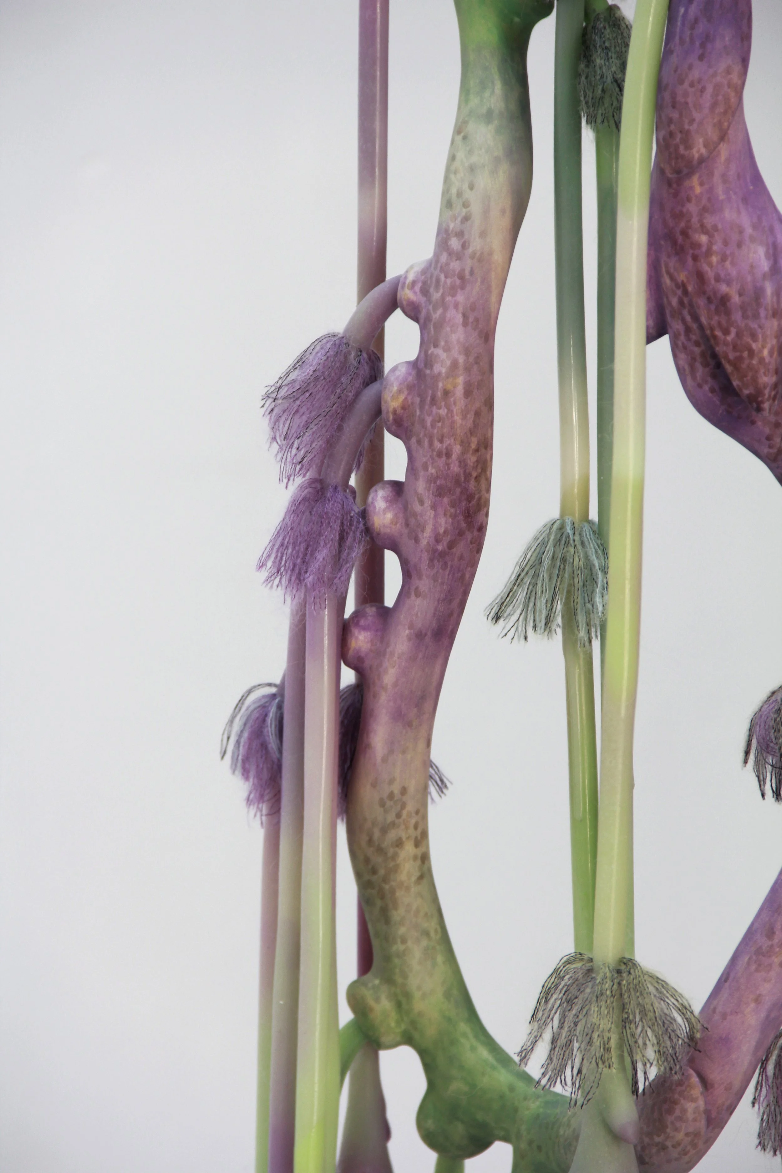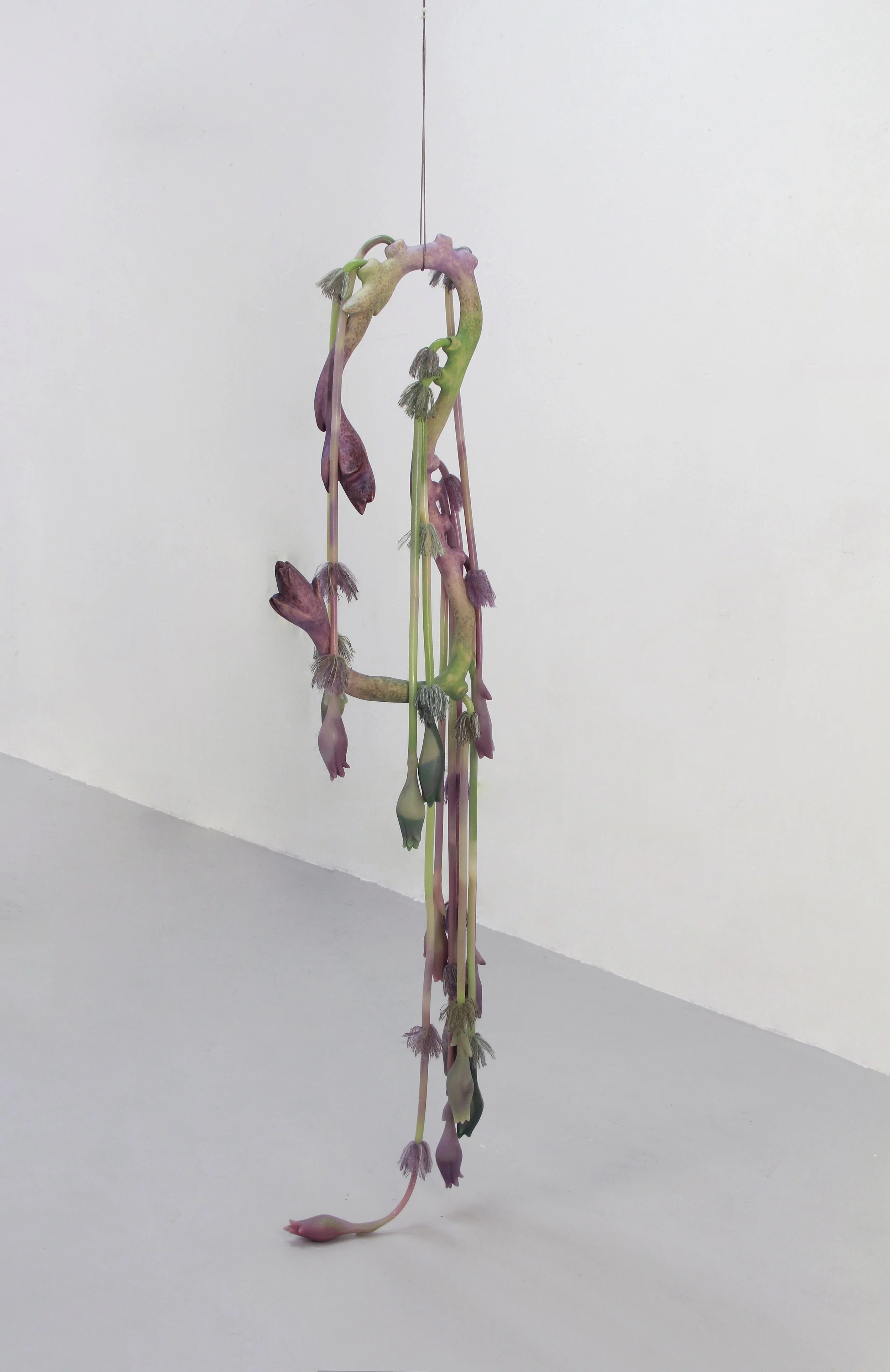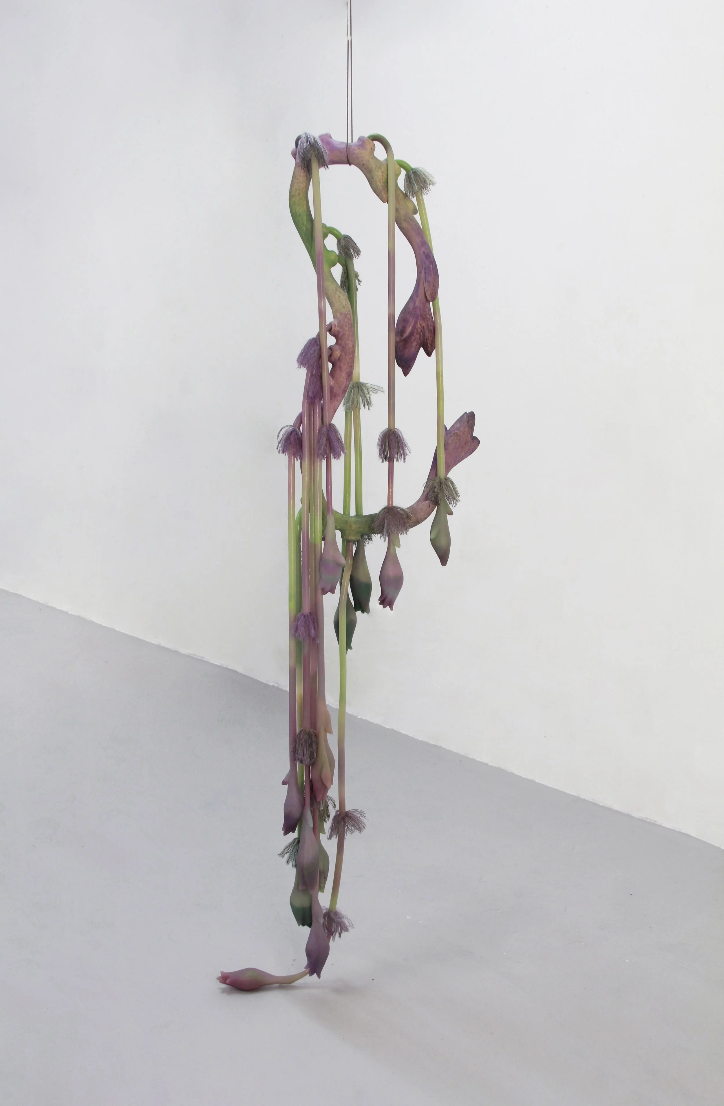 Pistil Vortex , 2025, Dyed basswood, silicone, watercolor, acrylic, mohair, silk, nylon, stainless steel, 160(h)x40(w)x30(d) cm