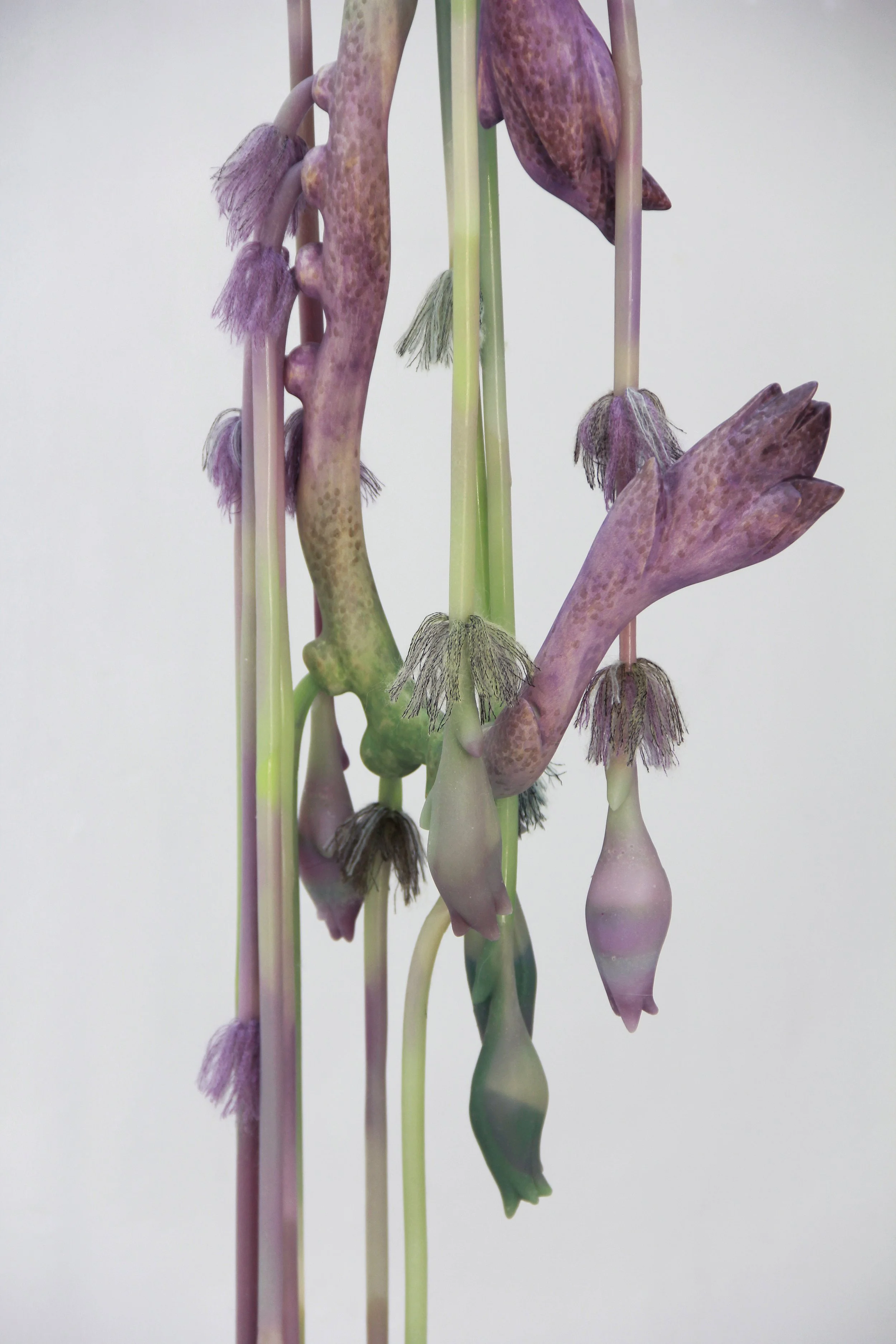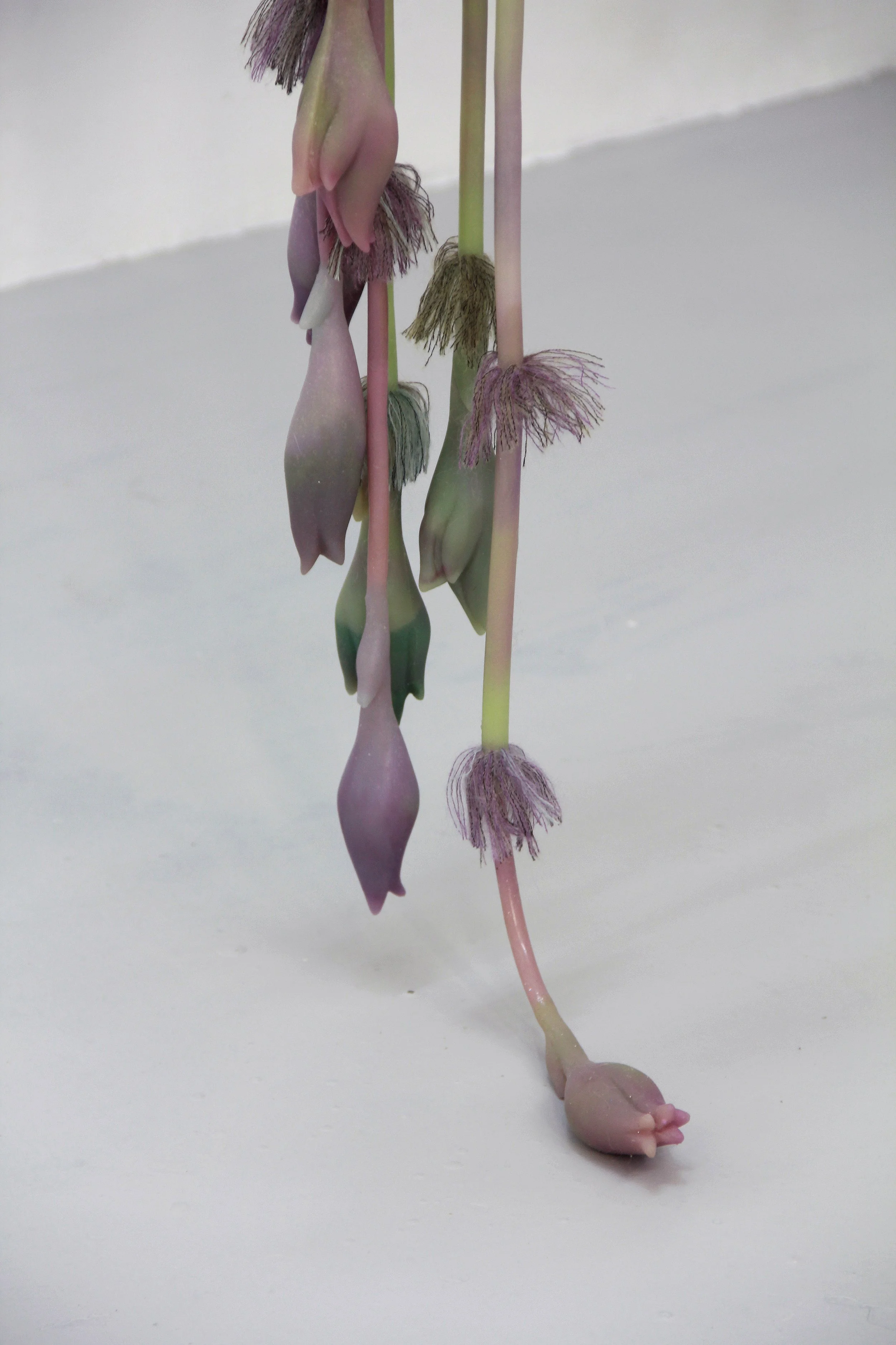 Dyed basswood, silicone, watercolor, acrylic, mohair, silk, stainless steel
