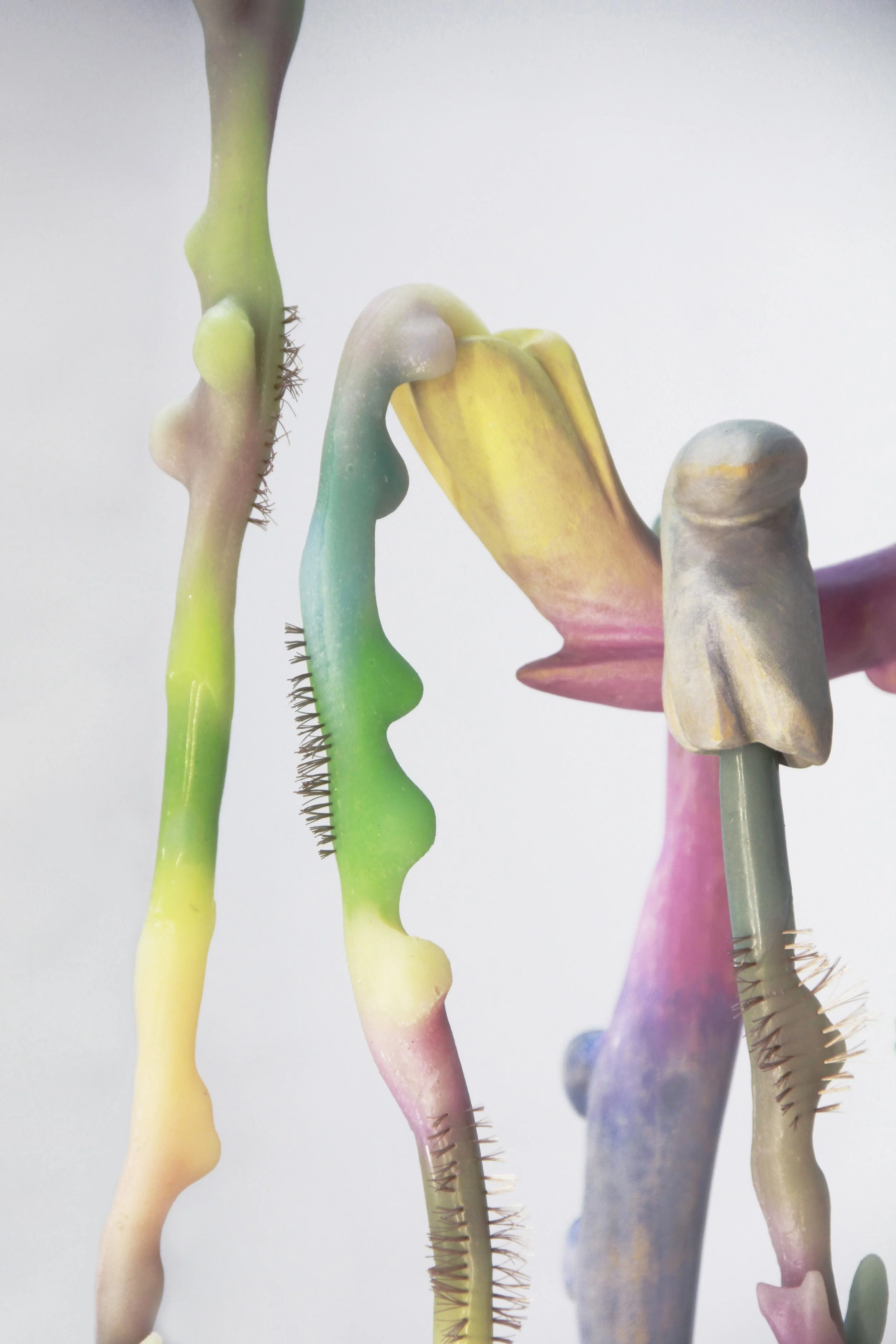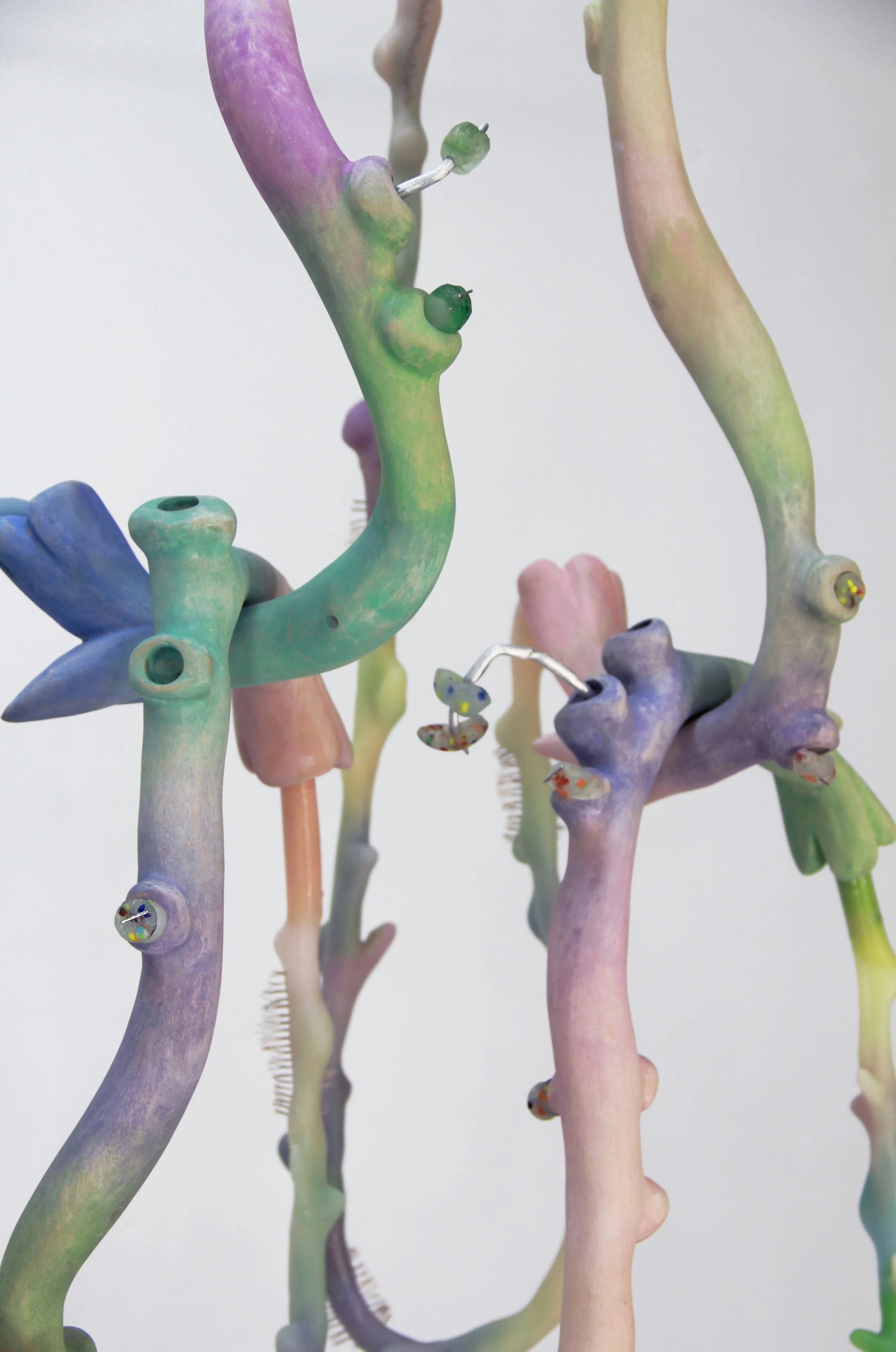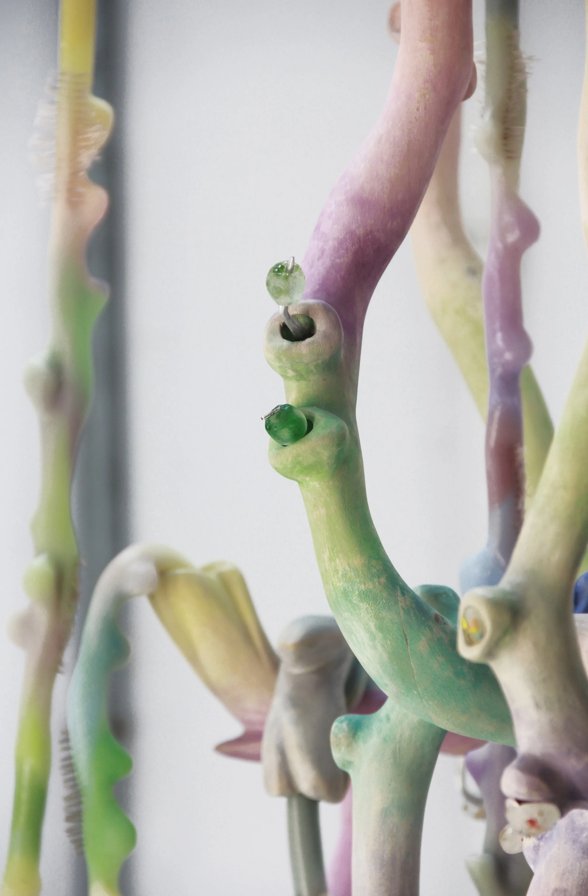 Dyed basswood, silicone, watercolor, glass, aluminum, nylon, stainless steel