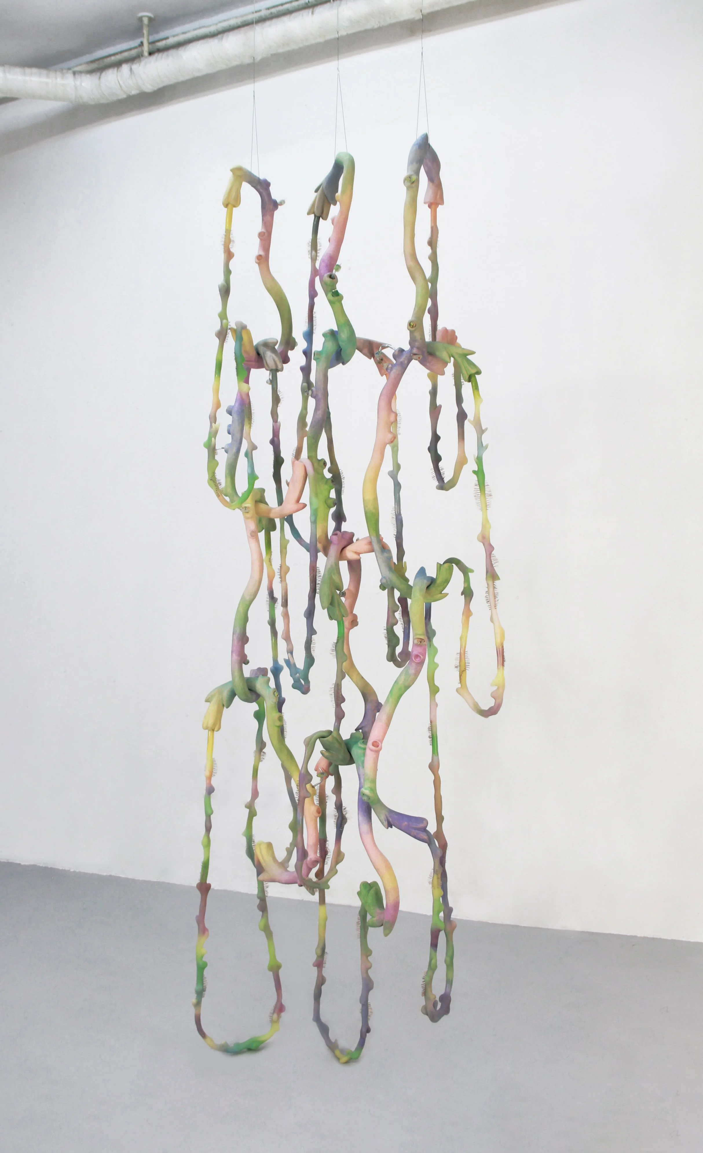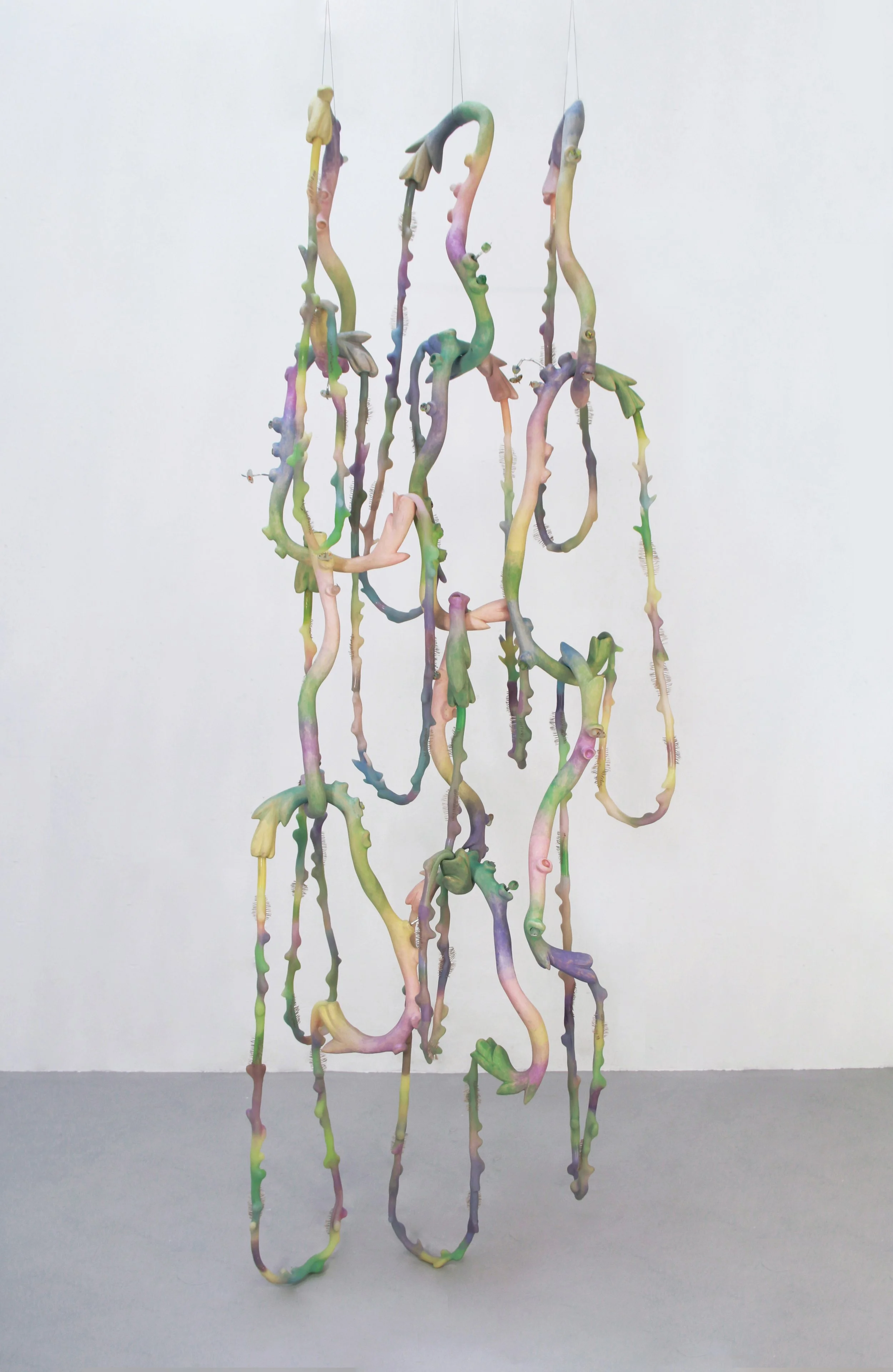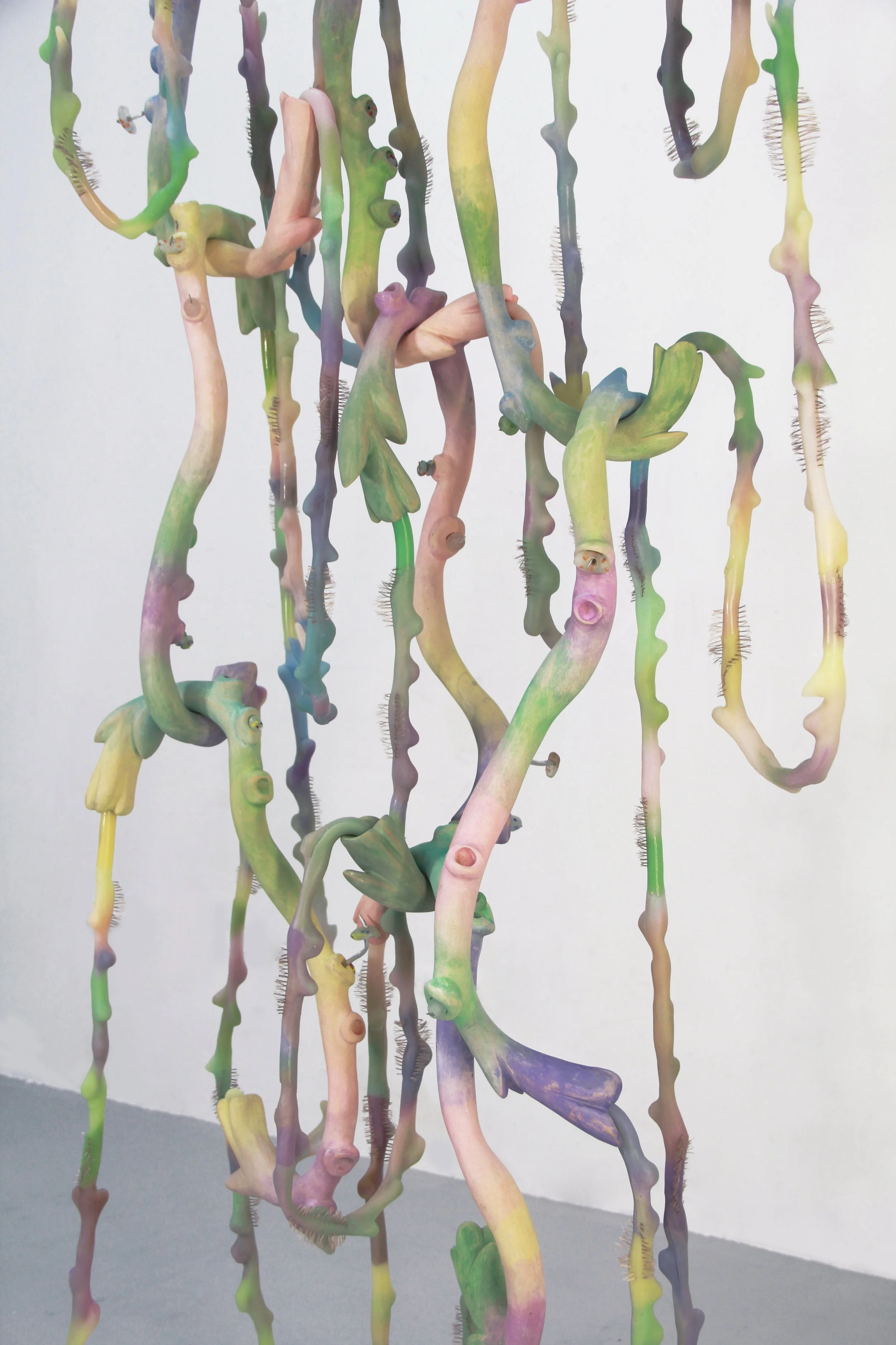 Dyed basswood, silicone, watercolor, glass, aluminum, nylon, stainless steel